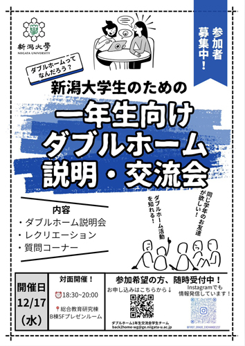 新潟大学の地域共創プログラム「ダブルホーム」に関心のある本学1年生向けに説明・交流会を開催します。