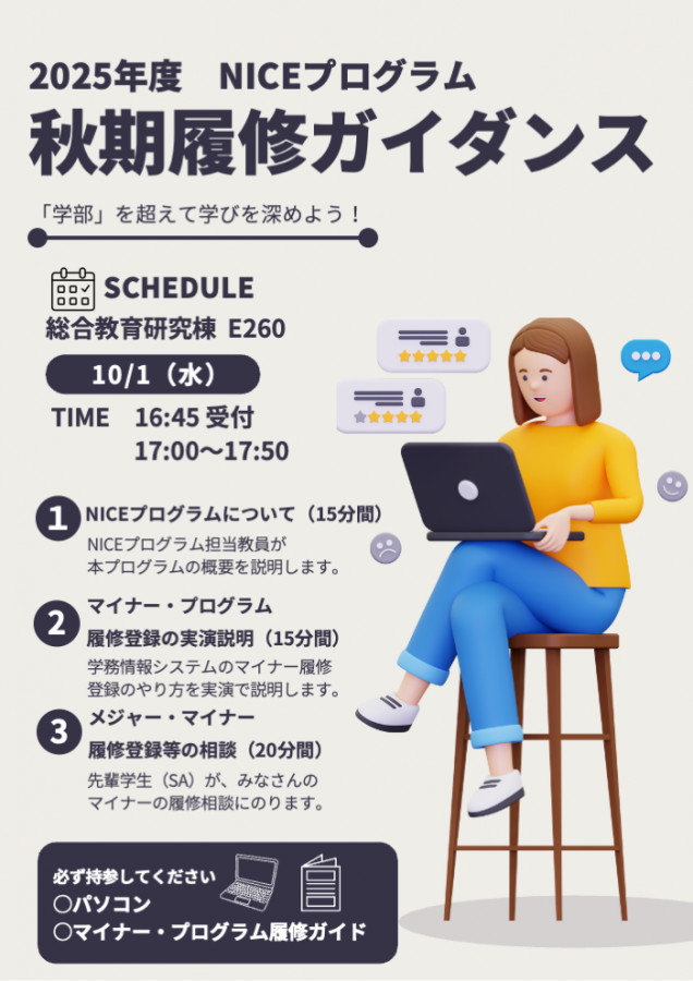 2025年10月1日(水)総合教育研究棟E260にて、NICEプログラム秋期履修ガイダンスを開催します。マイナー・プログラムやNICEプログラムについて聞きたい、マイナー履修方法がわからないなど、マイナーに興味・関心がある在校生の皆さんの参加をSA・NICEプログラム教職員一同お待ちしております!